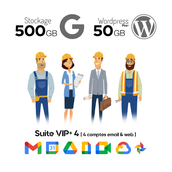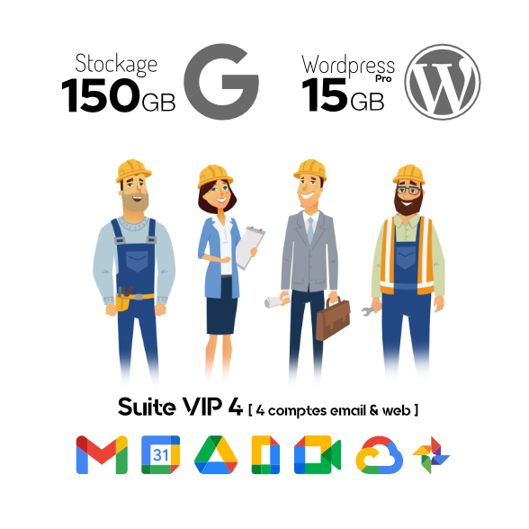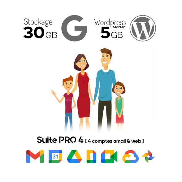 - Quatre comptes Google Workspace incluant quatre emails personalisés @dubreuil.fr sur la plateforme Gmail. Stockages (15Gb, 30Gb, 150Gb ou 500Gb)
