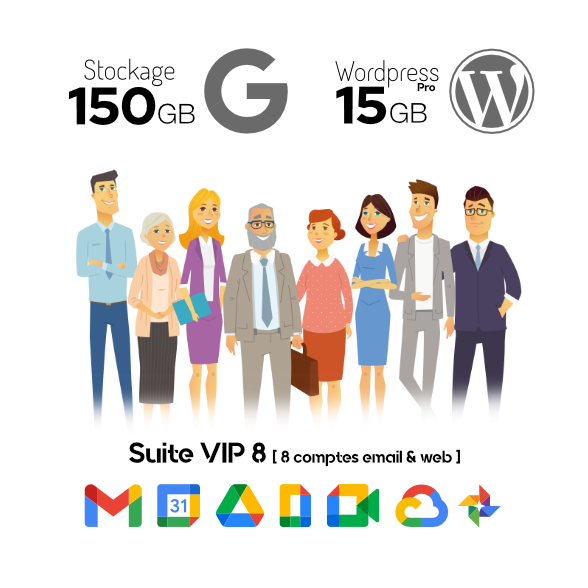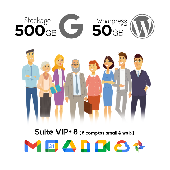 - Huit comptes Google Workspace incluant quatre emails personalisés @dubreuil.fr sur la plateforme Gmail. Stockages (15Gb, 30Gb, 150Gb ou 500Gb)